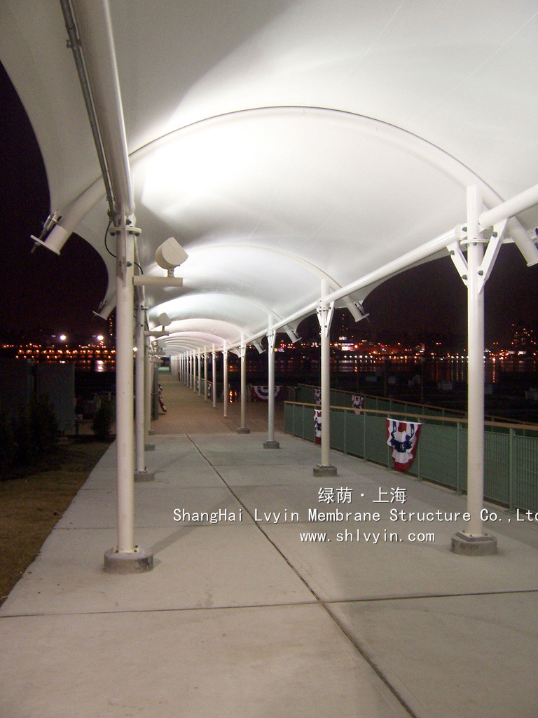 3. 永久性性膜材,使用年限30年以上。對(duì)太陽(yáng)能的反射率高,所以熱吸收量很少。即使在夏季炎熱的日光的照射下室內(nèi)也不會(huì)受太大影響。正是因?yàn)檫@種劃時(shí)代性的膜材料的發(fā)明,才使膜結(jié)構(gòu)建筑從人們想象中的帳篷或臨時(shí)性建筑發(fā)展成現(xiàn)代化的永久性建筑。