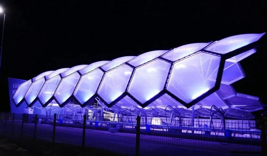 ETFE的商業(yè)用途包括許多運(yùn)動(dòng)場和娛樂場所,這種塑料的動(dòng)態(tài)照明已經(jīng)成為ETFE建筑的一個(gè)成功特征。