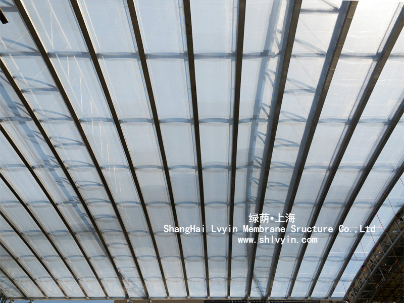 5)該材料不阻擋紫外線等光的透射,以保證建筑內(nèi)部自然光線。根據(jù)位置和表面印刷的情況,ETFE膜的透光率可高達(dá)95%。通過(guò)表面印刷,該材料的半透明度可進(jìn)一步降低到50%。